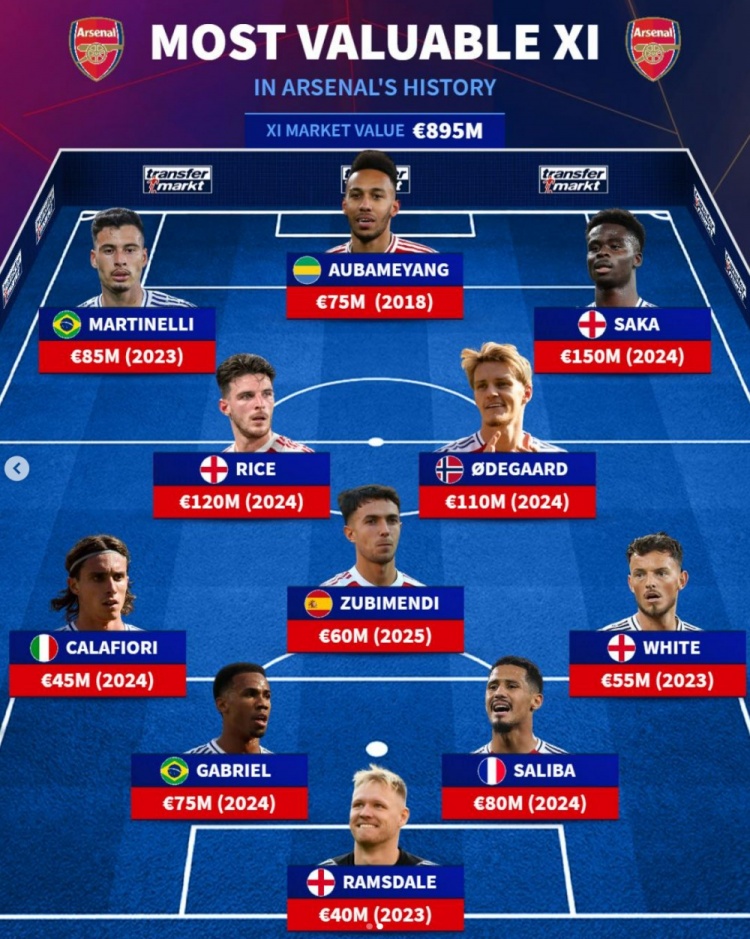 马丁内利(2023年,8500万欧)、奥巴梅扬(2018年,7500万欧)、萨卡(2024年体育赛事直播,1.5亿欧)