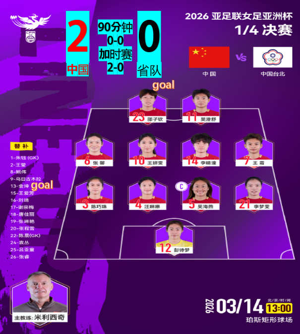 加时赛第3分钟,陈巧珠长传给禁区的王霜,王霜传到弧顶,邵子钦远射破门【1-0】。第112分钟敌手踢倒邵子钦,乌日古木拉点球被扑。第117分钟金坤冲破带底线传中变成乌龙【2-0】锁定胜局。