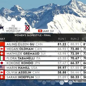 仔细看,谷爱凌代表的也曾中国队,她的滑雪服上是中国的国旗。在排名榜上,中国队的国旗也把加拿大队、瑞士队、日本队等国度的选手(国旗),甩到了背面。#谷爱凌#