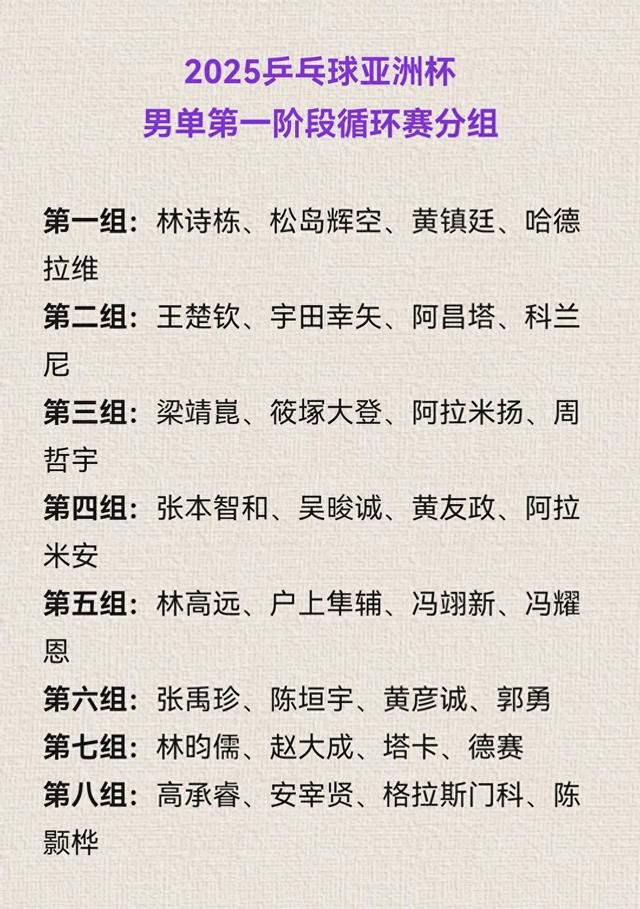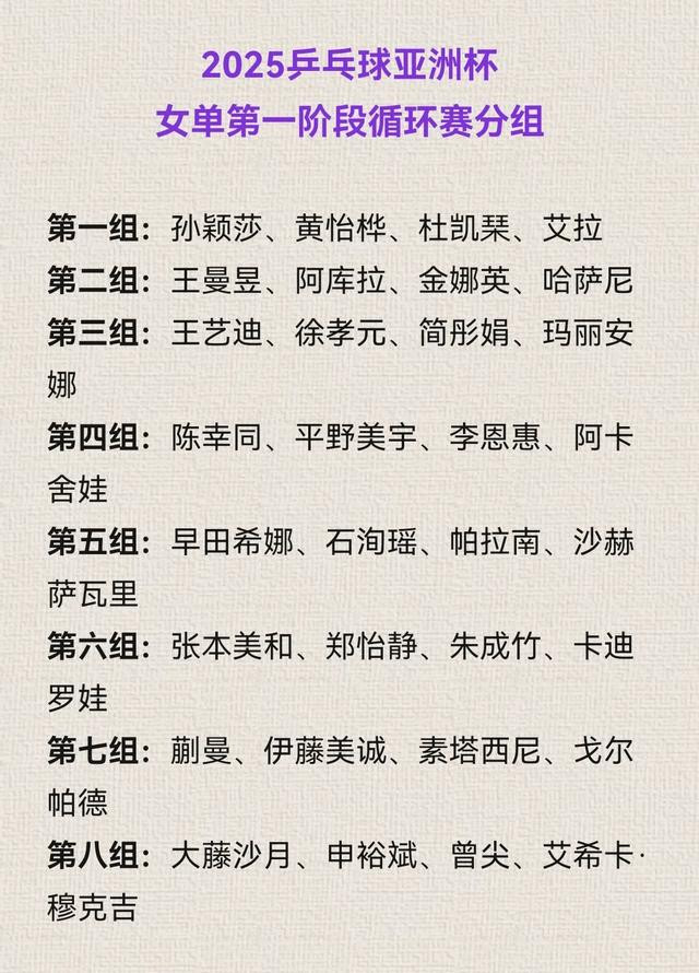 字据既定例则,本年的亚洲杯分组禁受2月11日海外乒联2025年第7周的最新寰宇排行细则种子,国乒男队林诗栋、王楚钦、梁靖崑、林高远4东说念主赢得种子签位,国乒女队孙颖莎、王曼昱、王艺迪、陈幸同、蒯曼5东说念主赢得种子签位。