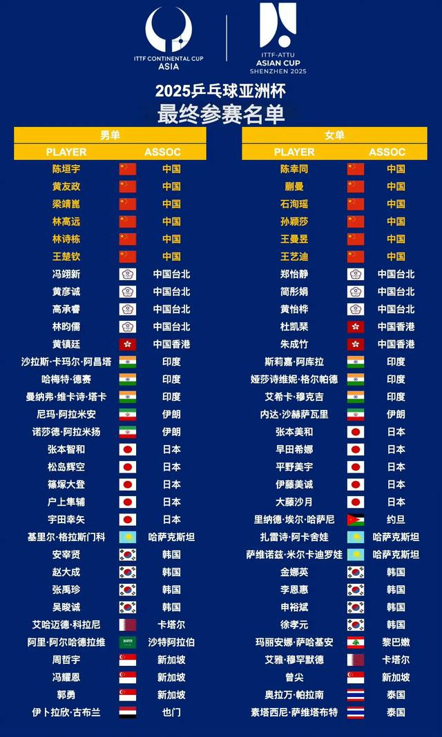 2025乒乓球亚洲杯最终参赛名单及转播平台如下: